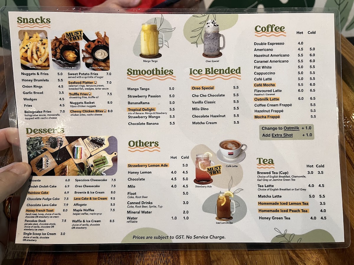 The menu is designed to accommodate different dining occasions, including quick orders, light meals, and casual gatherings. Food items are priced moderately and can be paired with beverages available at the cafe to complete the dining experience.
